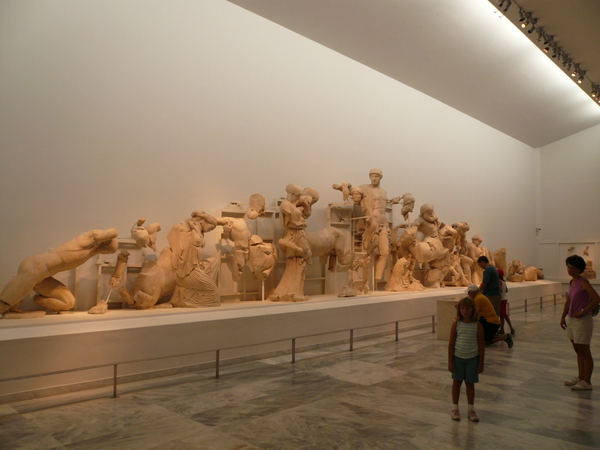 後來還有去他的博物館,裡面珍藏了很多很多挖掘出來的雕像,剛進去,兩排長長的古代雕像多麼雄壯威武阿!只可惜有些挖掘出來的不完整,有些少頭少腳少身體,不過慶幸的是前面都有導引牌,上面除了介紹還有復原模擬圖,讓人清楚的想像出當初擺在運動場和神廟裡面的藝術。